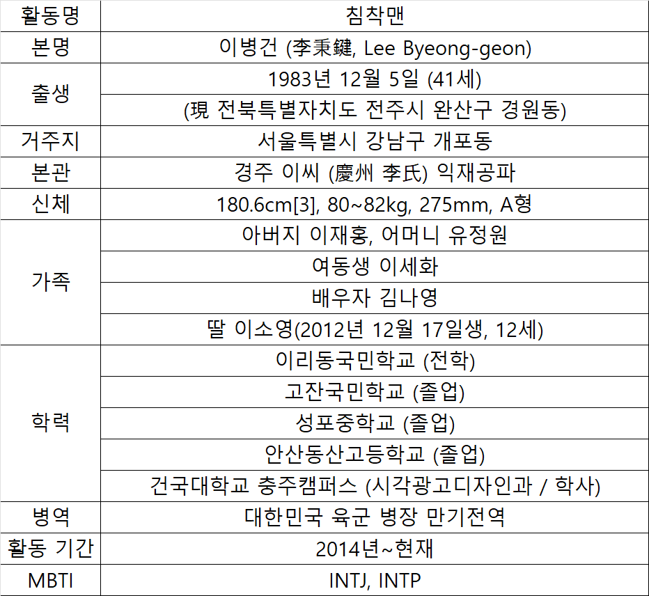 - 이름: 침착맨 (본명: 이병건)