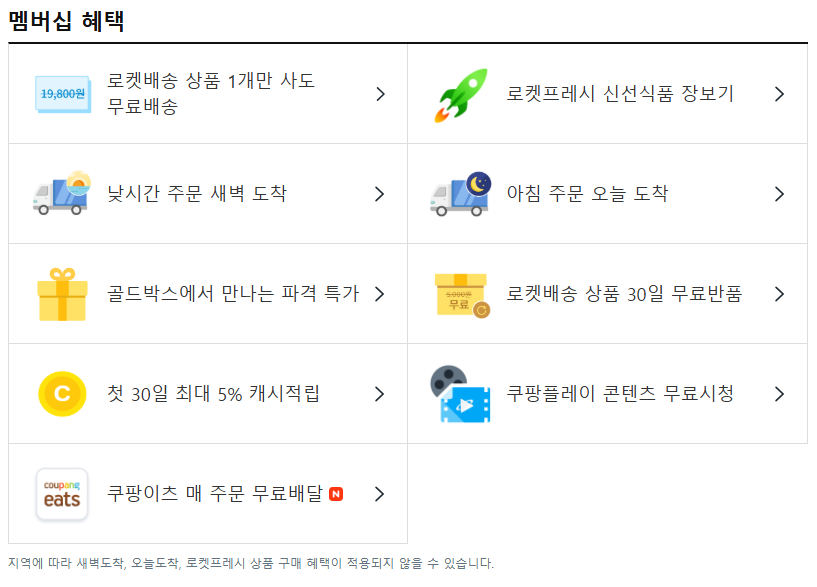 | 무료 배송 | 1,000원짜리 소액 구매도 추가 비용 없이 무료 배송 (로켓배송, 로켓프레시 포함) |