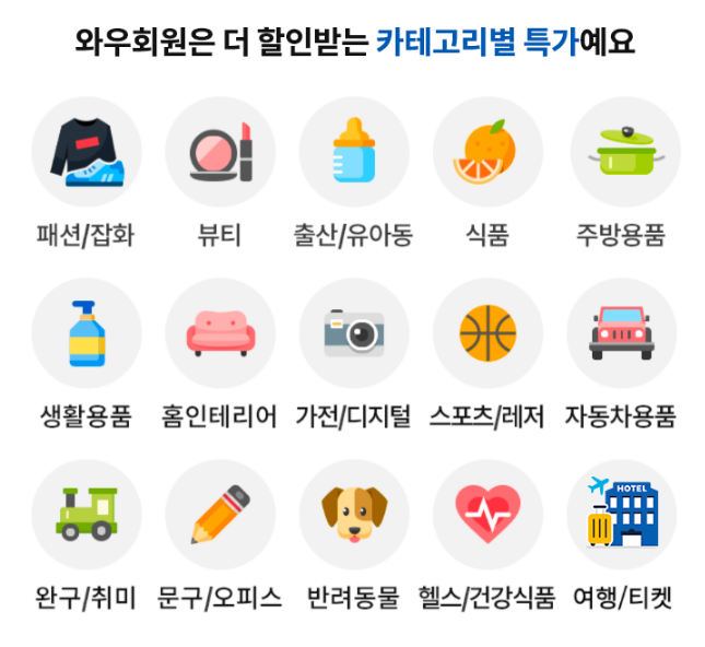 | 와우 전용 할인 | 특정 상품에 대해 와우회원만의 추가 할인을 제공하여 월회비 이상의 절감 효과를 볼 수 있음 |