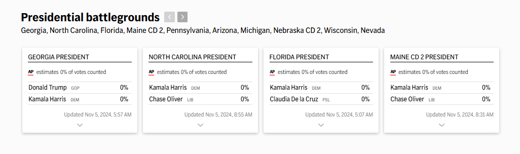 ㅇAssociated Press(AP): 편견 없는 보도를 제공하는 신뢰할 수 있는 소스인 AP는 지속적으로 업데이트되는 투표 수와 심층적인 주별 분석을 제공합니다.