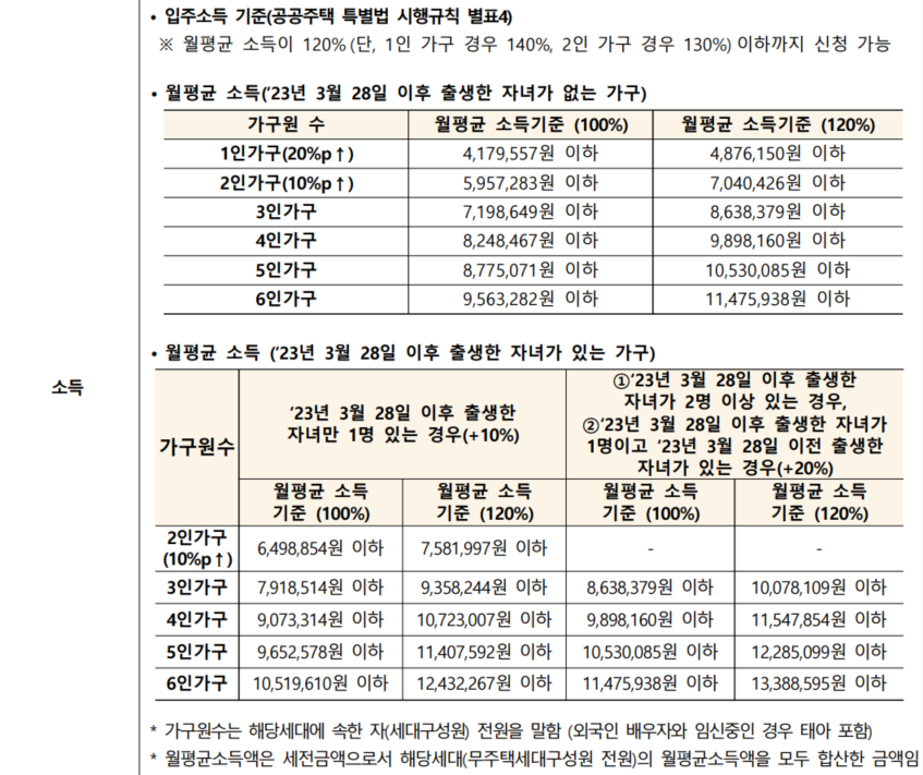 - 세대 소득 기준은 전년도 도시근로자 가구당 월평균 소득의 100% 이하이어야 하며, 일부 경우 120%까지 인정됩니다.